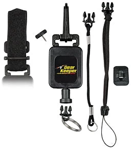 Gear Keeper Deluxe Gear Tether – Multiple option mounting system for things as heavy as digital cameras. Includes three connection options as well as a pad-eye kit for things without lanyard loops. Features a Spectra/Nylon line, stainless steel spring and hardware, 9 oz retraction force and a 60 lbs breaking strength.