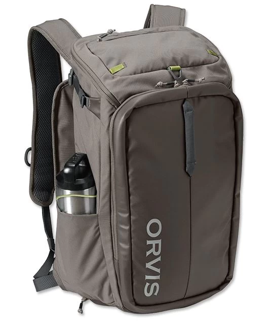 When it’s time to go, the Orvis Bug-Out fly-fishing backpack lives up to its name. Floatplane, jet plane, truck, drift boat, or your own two feet, this backpack is designed to take what you need and make it easy to find it when you need it. It’s a fishing backpack by design, but it easily crosses over to travel as a carry-on or overnighter. Streamlined design offers top and side-entry access with internal zippered drop pocket and removable divider for gear storage options. Back panel integrated net holder for quick and easy storage for even larger guide nets. External water bottle or rod tube holder with deployable extension to lower rod tube to shoulder height. Shoulder straps feature accessory docking stations and fly patch, plus buckle receivers for compatible Chest Pack (#25FS) and Chest/Hip Pack (#25FT). Padded front pocket accommodates a hydration bladder or laptop and tuck-away hip straps distribute load. Tricot-lined sunglass/phone pocket on top flap. Ridged back panel for increased air flow. Weight: 1 kg/2.2 lbs. In sand. Shell: 100% recycled CORDURA® ECO 600 denier polyester with strategic TPU coating. Liner: 100% recycled 200 denier polyester. Spot clean. Imported.