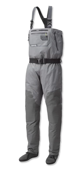 The Orvis PRO Wader is built for the professional angler whether by trade or simply by passion who will go to whatever extreme necessary to find fish. Built with an athletic fit, the PRO Wader uses an extremely durable proprietary 4-layer Cordura® fabric shell in the upper and 5-layer Cordura fabric shell in the lower legs for the best in class abrasion and puncture resistance. Low profile seam construction and a gusseted crotch enhance movement and seam strength. Modern anatomically correct neoprene booties have less bulk with a true “sock” feel and are more comfortable inside wading boots, while the streamlined PU reinforced mesh gravel guard covers the boot tightly and completely eliminates drag and water collection. Convenience features include an external storage pocket with YKK AquaGuard® water-resistant zipper to keep essentials dry and prevents loss. Rubberized tabs on suspenders and front pocket daisy chain for tool docking, offer multiple locations for essentials and eliminate chance of puncturing waders or losing tools. Fly patch on front pocket for quick changes and drying. Large four-way stretch power mesh interior pocket expands to fit larger items yet stays out of the way when empty. Kangaroo-style fleece-lined handwarmer pockets with YKK AquaGuard water-resistant zippers. Removable OrthoLite® knee pads use the same technology found in our PRO Boot insole for optimal comfort and rebound. Removable accessory pocket allows for quick access to gear and offers the features of a small pack. Adjustable elastic suspenders with opposing buckles for waist-high conversion.