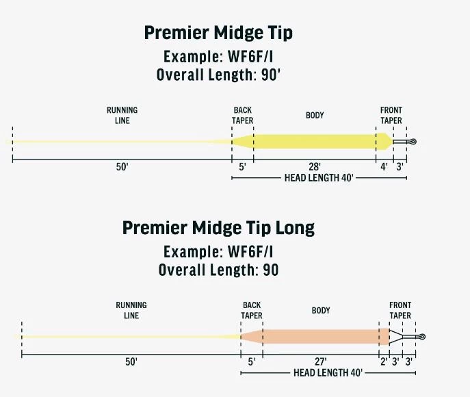 The Premier Midge tip is a floating line with either a 3ft or 6ft long, clear intermediate tip that sinks 1.5 inches per second or a gray hover option that sinks 1 inch per second. This is deadly effective on windy days, when fishing in shallow bays, close to lake shores or over the top of weed beds, and is perfect for fishing nymphs, emergers, and chironomids (buzzers). Each line is built with a supple coldwater core, SlickCast coating, and welded loops on the front and back for fast rigging. With options available in regular and long, hover and intermediate, it is a must have line for lake anglers everywhere.