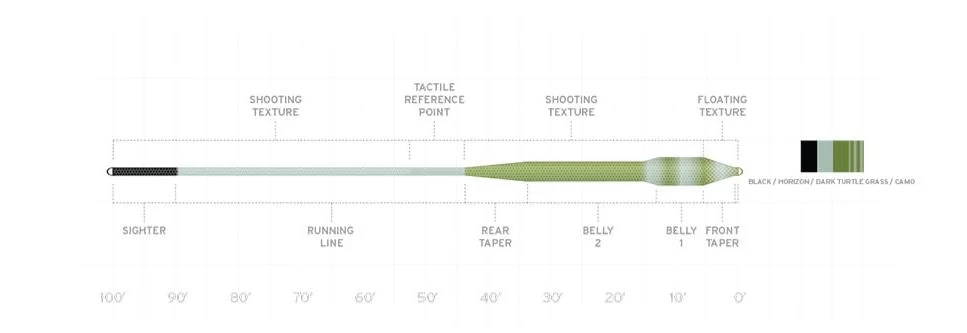 - High-contrast sighter to identify the back of the line when fighting fish; camo tip for stealth
