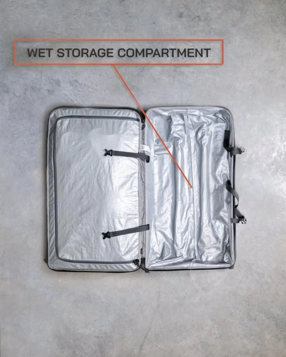 - Clamshell zipper opens to top compartment, plus middle and lower wet/dry storage compartments