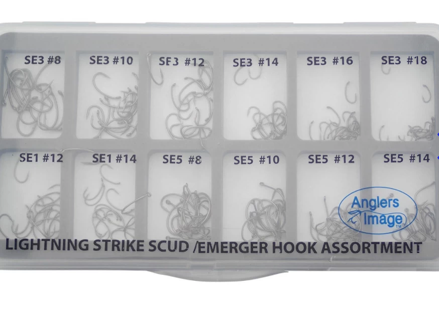 The Scud/Emerger Lightning Strike Assortment contains 15 each of model SE1 hooks in sizes 12-14, model SE3 hooks in sizes 8-18, and model SE5 hooks in sizes 8-14.
